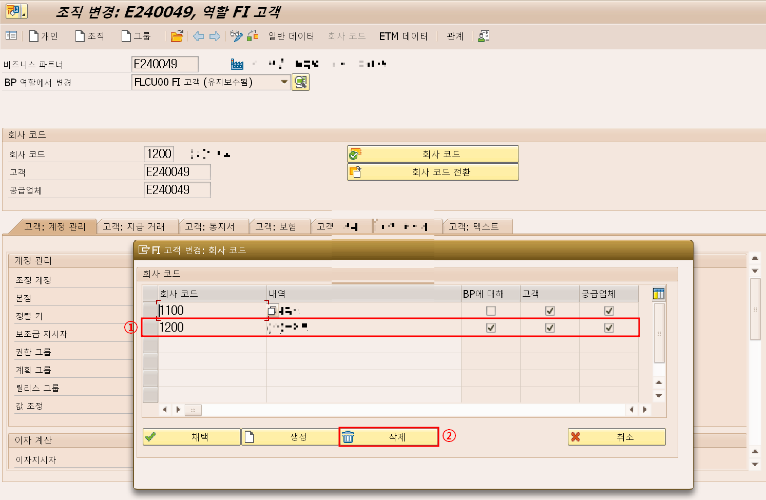 T-CODE : BP 트랜잭션 BP에서 고객과 공급업체에 이미 생성된 회사코드를 삭제하는 것은 불가능하다. 삭제 버튼이 활성화 되어 있긴 하지만 아래와 같이 회사 코드 1200 라인을 선택하고 삭제 버튼을 클릭하면 "1200 회사 코드가 이미 저장되었으므로 이를 삭제할 수 없습니다."라는 메시지가 발생한다. 따라서 해당 회사 코드의 고객 및 공급업체 BP에 대한 전표가 생성되지 않도록 차단 플래그를 설정할 수 있다. * 고객일 경우1. FLCU00 역할을 선택한 후 회사 코드 섹션을 클릭한다.2. [고객: 상태] 탭에서 "선택한 회사 코드" 필드에 체크한 후 저장한다.3. 아래와 같은 경고창이 발생하면 '아니오' 클릭하여 변경된 BP 정보를 저장한다. T-CODE : FB01 회사 코드 1200, 계정..